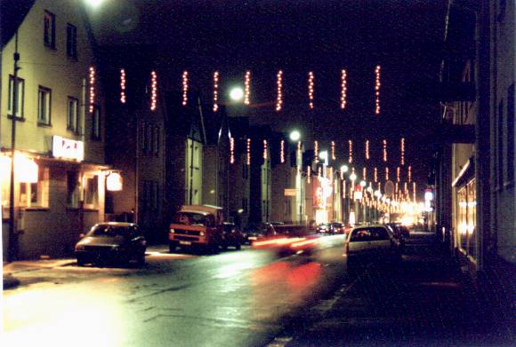 Blick in die Karl-Benner-Strasse mit Weihnachtsbeleuchtung